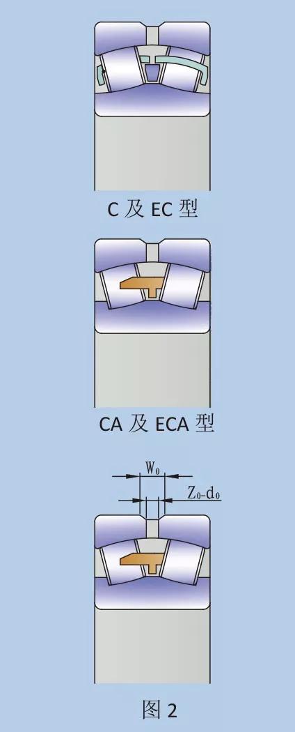 此類軸承具有對稱滾子,內圈有擋邊。導圈在兩列滾子中間,從內圈定心。保持架為一體式黃銅或鋼制機削架。CA 及 ECA 型采用 C 型式的表面加工,ECA 型帶有加強滾子,從而提高承載能力。